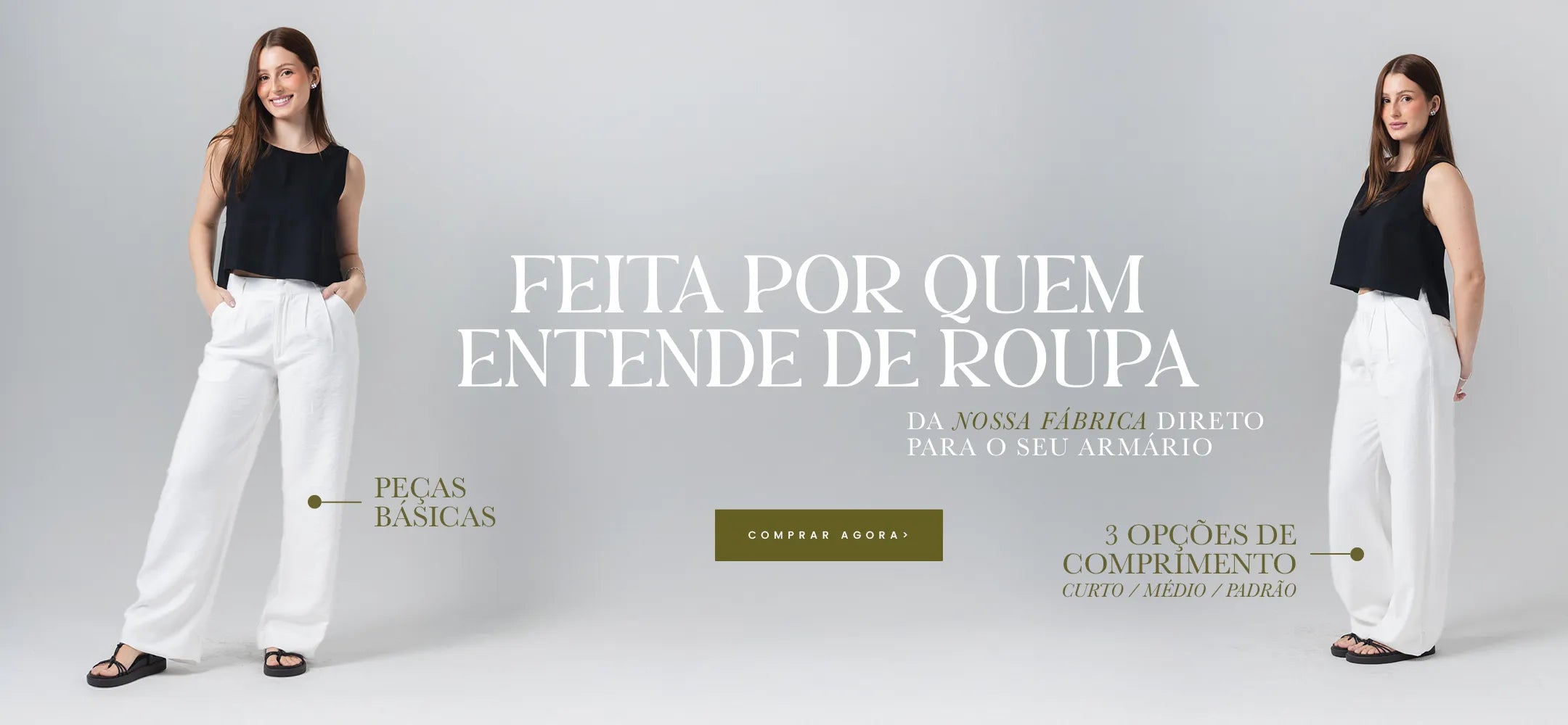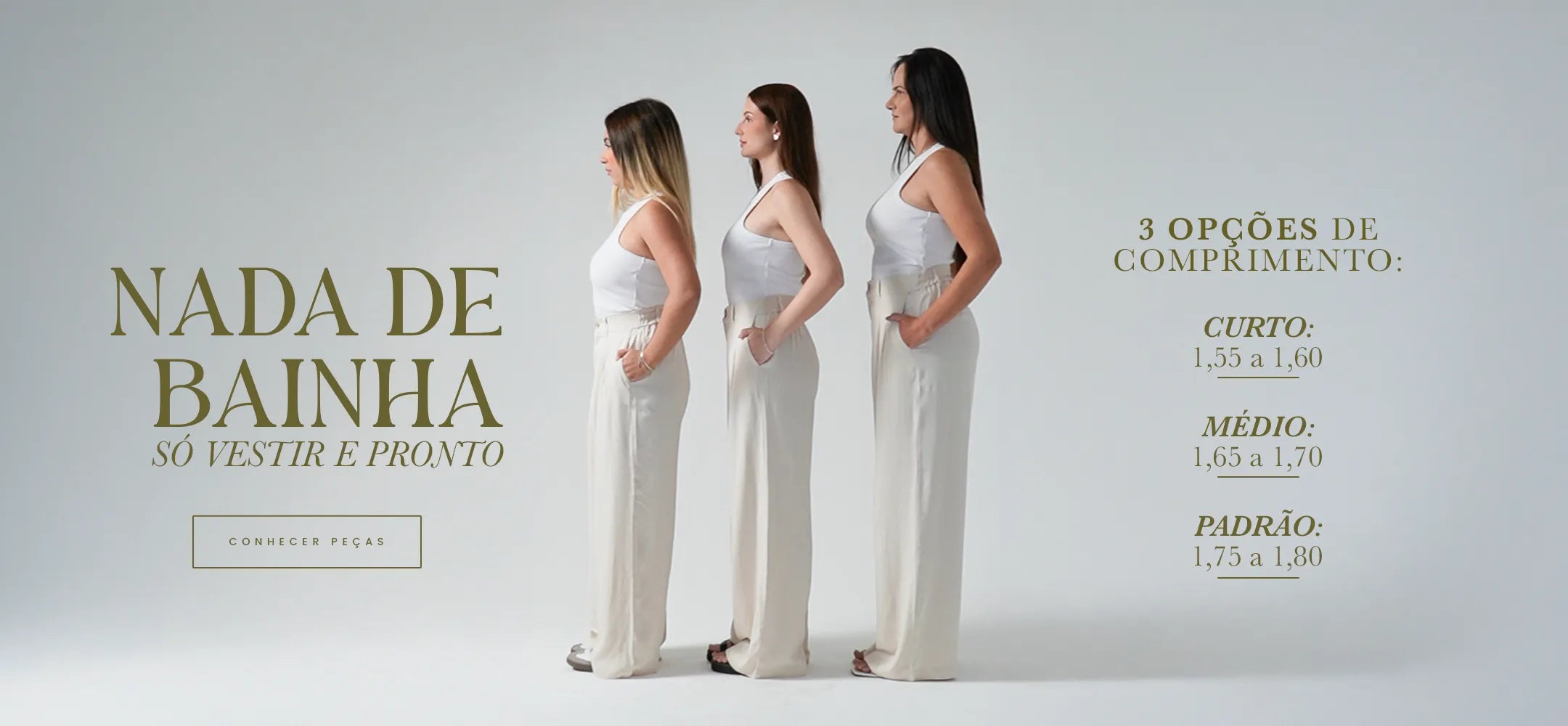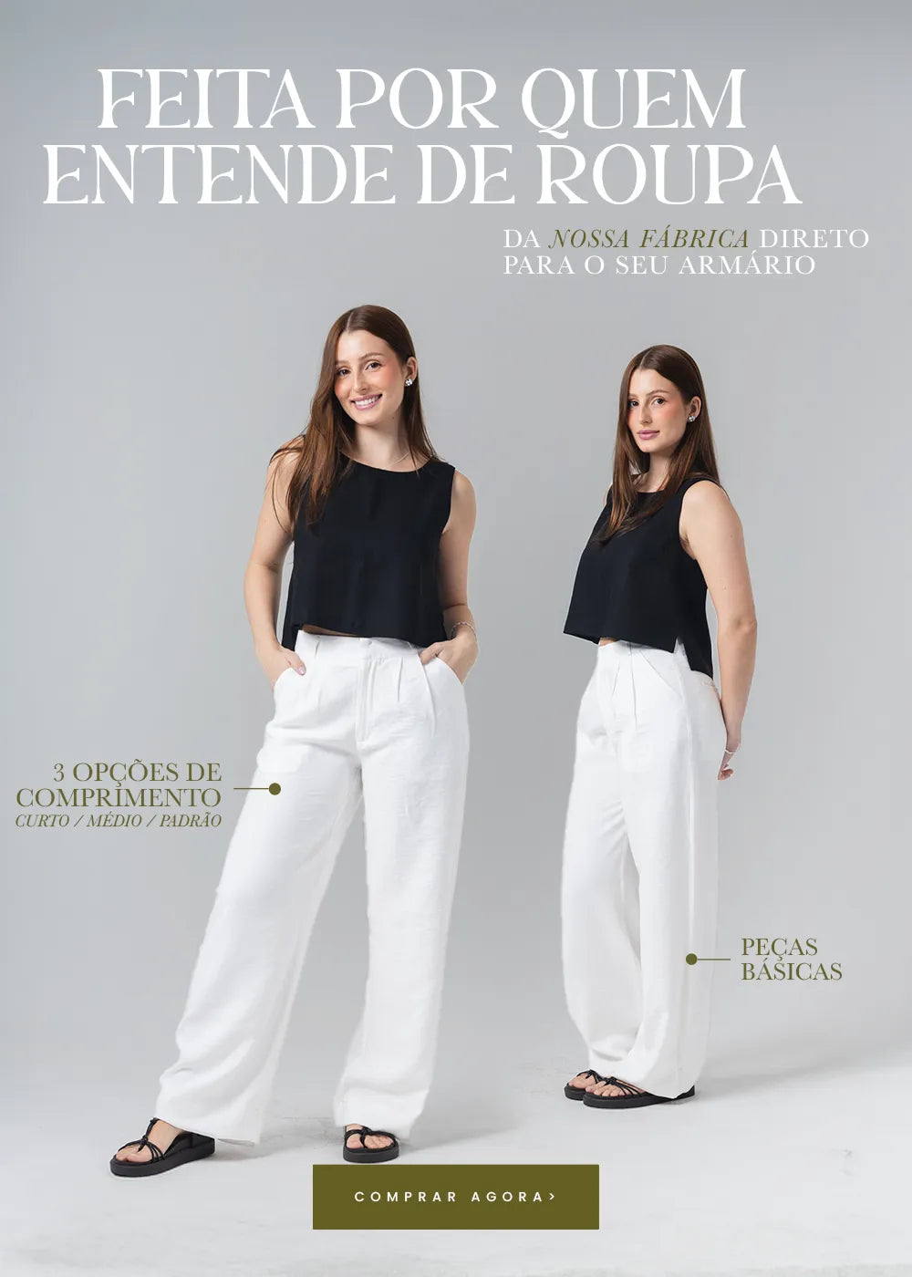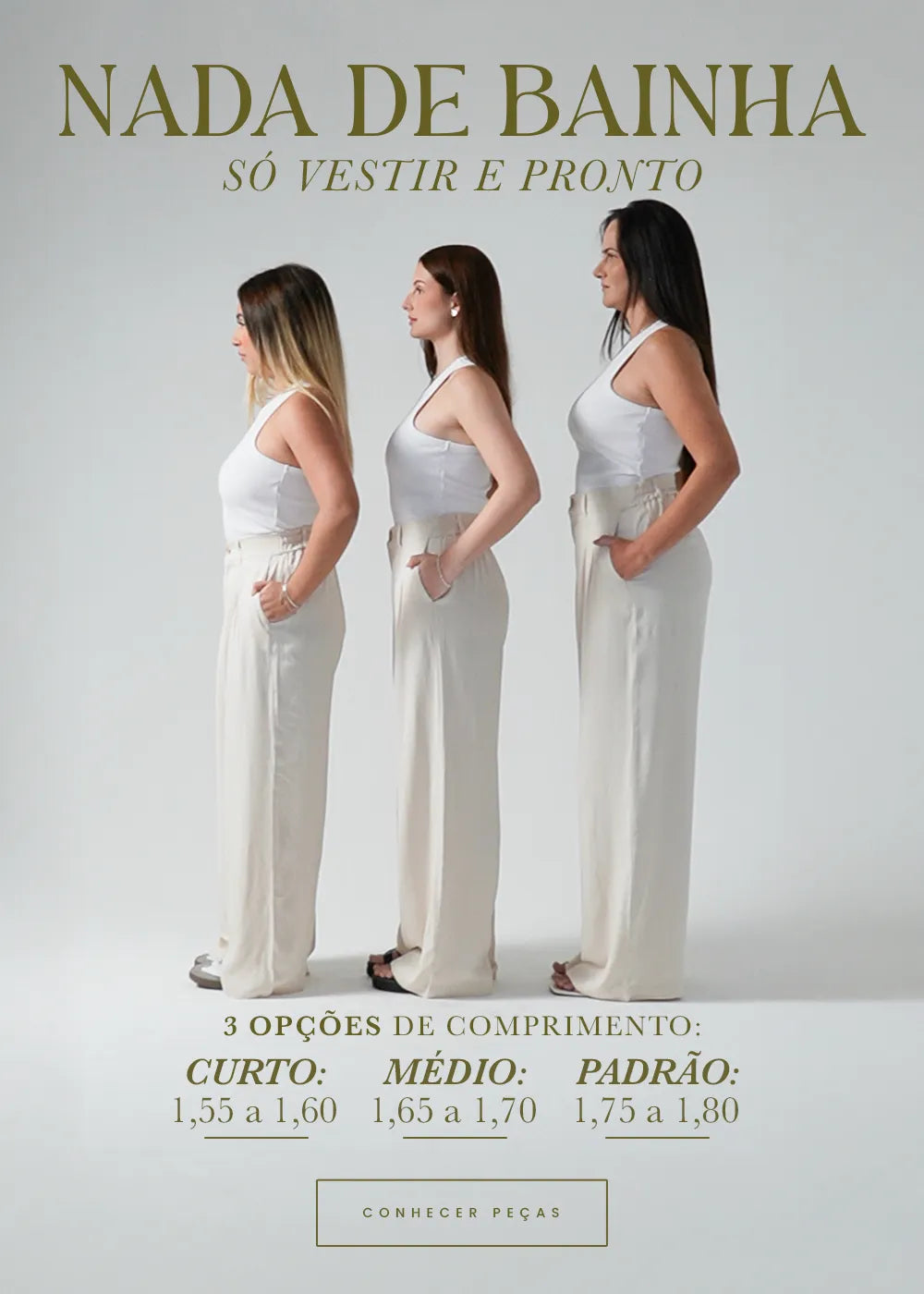 Estava com receio de comprar calça online, mas a tabela de medidas me ajudou muito. Pedi a Wide Leg Londres no comprimento curto e ficou exata. O tecido tem um caimento lindo, fluido sem ser mole. Dá pra perceber que não é fast fashion a costura e o acabamento são de outro nível.