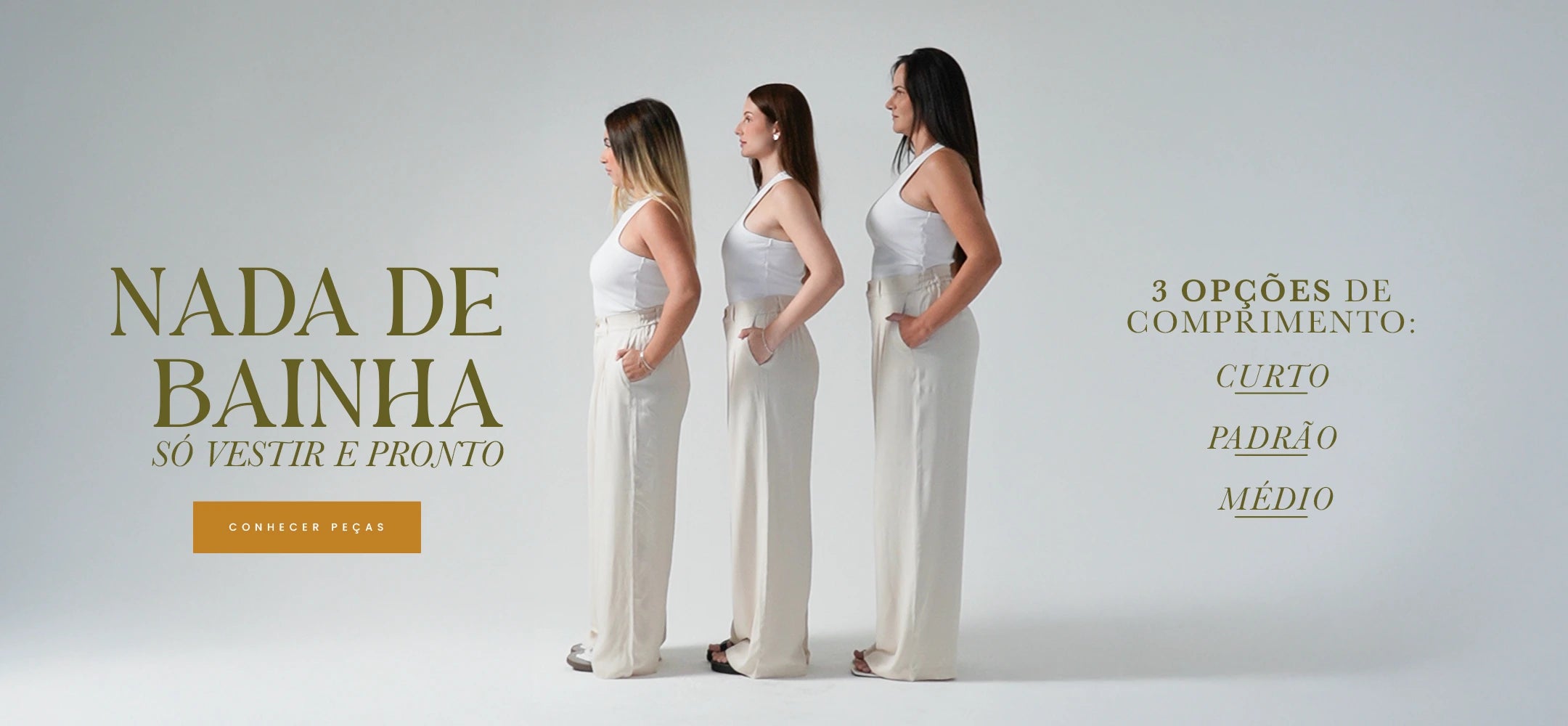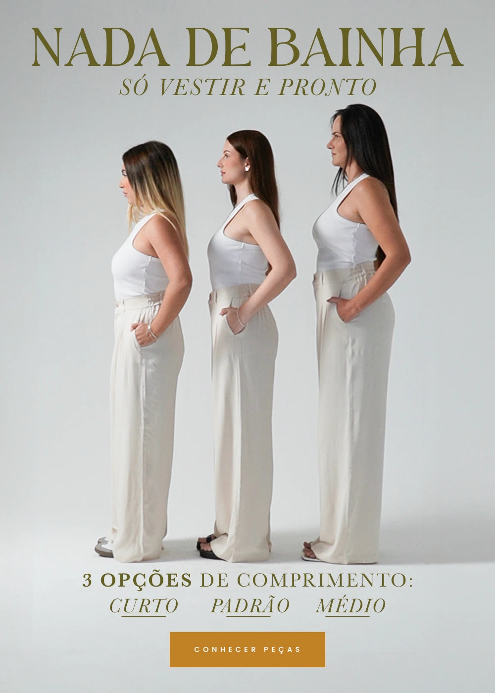 Estava com receio de comprar calça online, mas a tabela de medidas me ajudou muito. Pedi a Wide Leg Londres no comprimento curto e ficou exata. O tecido tem um caimento lindo, fluido sem ser mole. Dá pra perceber que não é fast fashion a costura e o acabamento são de outro nível.